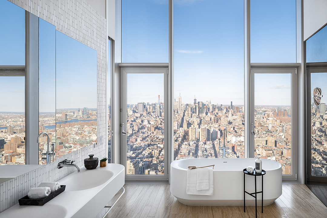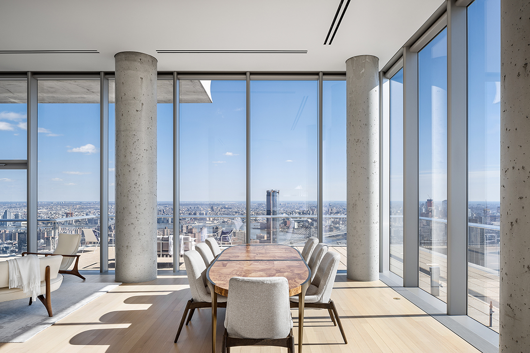We are excited to share a sneak peek of the final full floor penthouse located at 56 Leonard in NYC. Dubbed as a glass villa, Penthouse 57 towers at over 700-feet and is listed for $29.5M. The high-end property comes fully furnished by Jane Saidenberg of studio D featuring custom exterior and interior design by Herzog & de Meuron. This soaring property features 14′ ceilings,14′ foot window walls in every room, 5,252 square feet of space, four-bedrooms, 4.5-bathroom home and an impressive 1,763-square-feet of outdoor living spaces.The new owner will also enjoy tons of incredible views from river to river as well as views of midtown, the iconic downtown skyline and a dozen bridges, which can be adorned on one of the three sizeable terraces and balconies.The property also includes sprawling entertaining spaces in five distinct yet free-flowing zones with a great room, library with venetian plaster wood-burning fireplace, a den, a dining Room and an open kitchen, to name a few features.A stylish and functional space, the new owner will love the modern open kitchen with its sculptural Absolute Black granite kitchen island with custom-sculpted floating vented hood cover and master bedroom suite with a private terrace and Thassos marble with radiant heated floors, a steam shower with built-in tile bench and dual shower heads and a free standing soaking tub. Three additional corner bedroom suites enjoy ample storage and en-suite baths.Corcoran has the impressive listing.