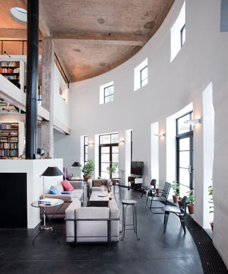 Located in a neighborhood that, according to the architect, resembles the Adirondacks, de Bretteville met no opposition to his plan for residing in the deteriorating concrete eyesore built in 1907. “People were really happy that someone was going to renovate it,” he says. In addition to the perfect locale, elements like the four concrete columns supporting the roof and the generous dimensions (28-feet high with a 50-foot diameter) made it ideal for reuse as a dwelling. “It was ready to be inhabited,” says de Bretteville, who insulated the 18-inch-thick concrete walls on the outside to maximize the thermal mass and increase overall energy efficiency.