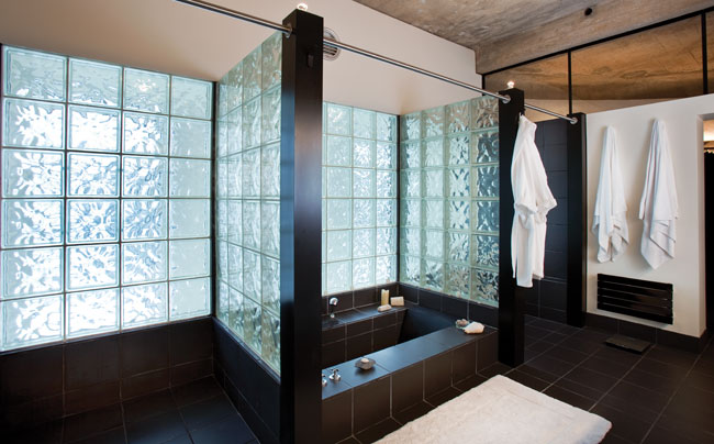 A perfectly scaled steel staircase provides access to the second floor, where a glass balcony (“our most exotic element,” he says) leads to the master suite, which enjoys the same spacious 16 x 16 proportions as the library. Thanks to a bay window and a band of 30-inch-high clerestory glass, the sleeping quarters enjoy natural light from all four sides.