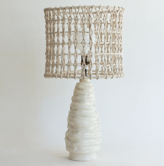 Connecticut ceramic artist Frances Palmer collaborated with Chad Jacobs of Bone Simple Design to create the Brancusi lamp. It is handcrafted of white earthenware and topped with a woven rope shade, a design that elevates a simple table lamp to an intricate art form. $3,600, Frances Palmer Pottery, Weston, 203-227-7204, francespalmerpottery.com, bonesimple.com.