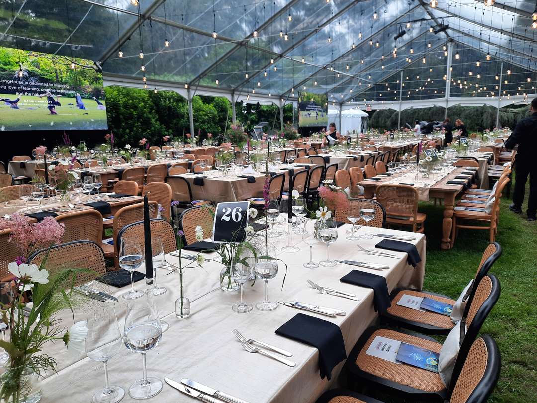 Following a post-concert reception among the sculptures and native plantings, guests proceeded to a buffet dinner presented on the LongHouse patio. Along with saluting Sanchez-Werner and his fiancé Tanya Yajnik, guests lifted glasses to toast the August 5 birthday anniversary of founder Jack Lenor Larsen whose vision created the 16-acre sanctuary, a gift benefitting the community with programs in art, nature, and wellness.