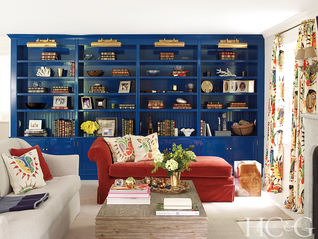 Accordingly, MacMurray endeavored to enhance the best parts of each room while also “tailoring the spaces and making them more cohesive,” she says. “We used Sarah’s existing furniture and fabrics as a guide.” Repainting a large jade green bookcase an Yves Klein blue, for example, lent gravitas to the living room, allowing a graphic fabric depicting African masks to take center stage on window treatments and throw pillows. MacMurray also reconfigured the furniture layout to center around the fireplace, commissioned a custom sofa, and relocated a coral-colored velvet chaise longue from the Wetenhalls’ New York apartment.