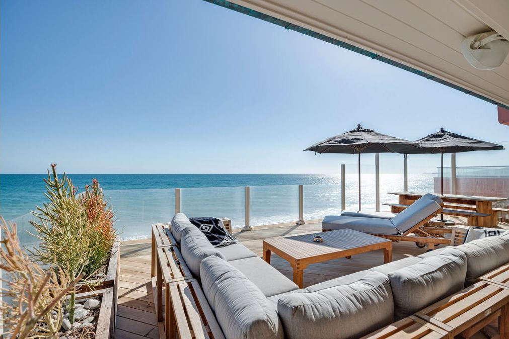 DiCaprio bought the home in 1998, but it has been recently renovated and now sports a sophisticated pale-on-pale palette and a modern-beach style. The living room features a marble fireplace and bleached-wood accents, while the galley kitchen has brand-new appliances and a herringbone backsplash that provides a pop of dark blue. Sliding glass doors lead out to the oceanfront deck, which has space for al fresco dining and relaxing. The home is ideally located on Carbon Beach, an exclusive stretch of oceanfront that is also known as “Billionaire’s Beach.”