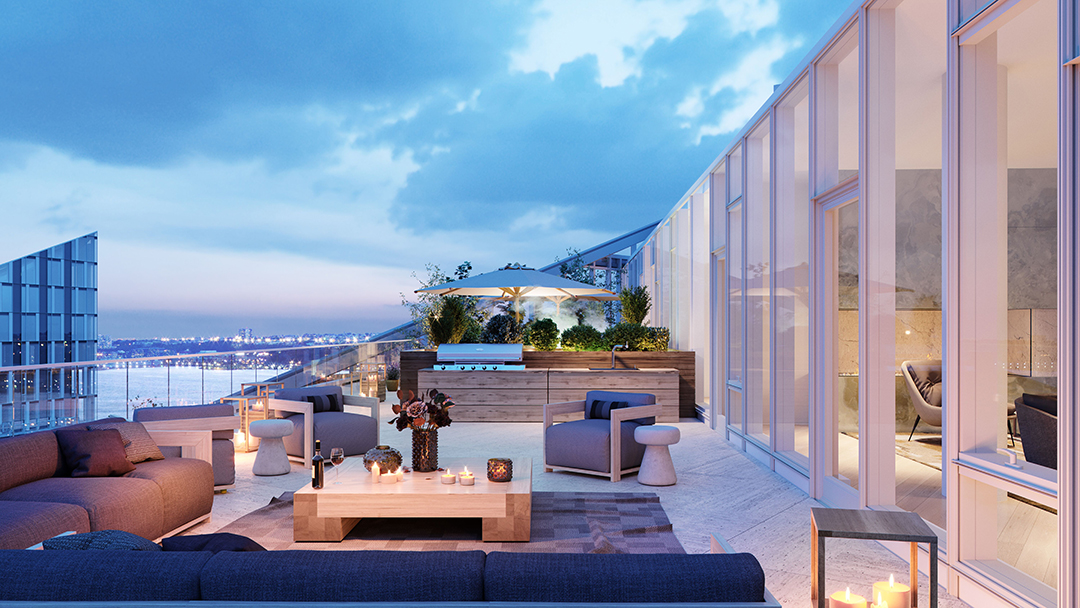 Costing nearly a 10th of the price and offering more outdoor space is the penthouse of the Lindley, a new development in the Murray Hill neighborhood of Midtown. Asking $2.915 million, the home has 1,200-square-feet of interiors, including two bedrooms and two bathrooms. The private garden outside adds 600-square-feet to this footprint; an outdoor kitchen and dining area are complemented by views of the Empire State Building. Ownership of the penthouse also comes with access to the building’s rooftop.