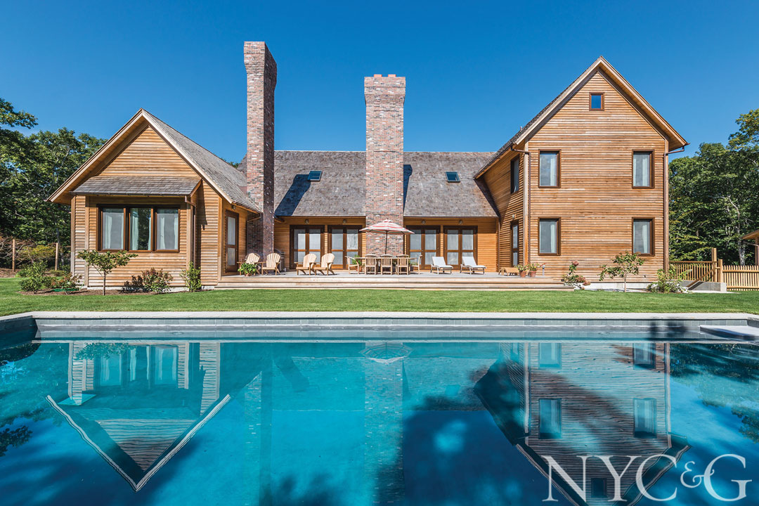 A: Antonios, Builder: The 5,300 square-foot main house has no wasted space, a great layout and cypress wood throughout with staggered plank floors and marble in the nine bathrooms. There are 100-year-old cottages in Montauk with cypress siding still in excellent condition. The home has room to grow if needed! The Italian-made kitchen has gleaming stainless steel cabinets, the countertops are Pentelikon marble and Sub-Zero, Wolf and Bosch appliances. There is a fitness room, steam room and sauna. Guests will love the glass wall staircase that leads to the second floor guest rooms. The mahogany windows are the European “tilt and turn” technology. There are 8’ leather covered mahogany doors and 25’ ceiling height in the great room. The house has highly-efficient geo thermal heating and cooling along with radiant heated floors in master bathrooms. Since I often travel worldwide, I have utilized the finest of technology and resources in the construction of this home.