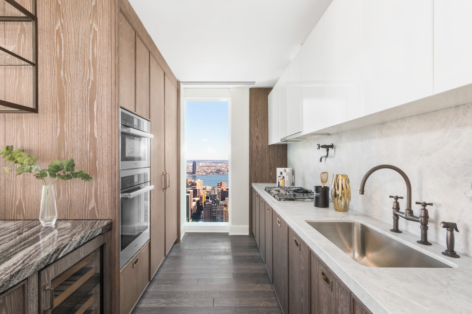The two-bedroom, two-bath apartment neighbors the clouds just as much as it neighbors its fellow posh units. Divine finishes are the cherry on top with custom-designed Molteni cabinetry, Nanz Hardware, Sub-Zero and Miele appliances, and an exquisite selection of high-end marbles.