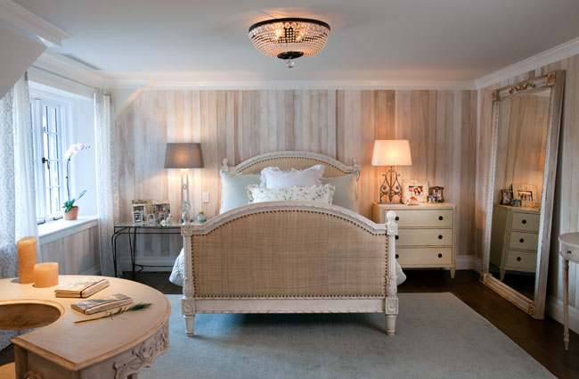 The paneling in this bedroom (from the home in “Well Manored,” CTC&G January) was originally going to be stained with a transparent light blue wash, but by mistake, a white primer was applied. Since Anne-Marie and Linda wanted the grain of the wood to show through, they had the pieces sanded back down. The builders started to nail them up but before they had the chance to redo the staining, “We walked in, we loved the quality it had and looked at each other and said…done! It was one of those magical mistake moments. It had the right amount of lightness and spontaneity that we couldn’t have achieved otherwise,” Linda says. She and Anne-Marie also called the paneling “pennyboard” because the space between each panel was created by sticking pennies in between the boards.