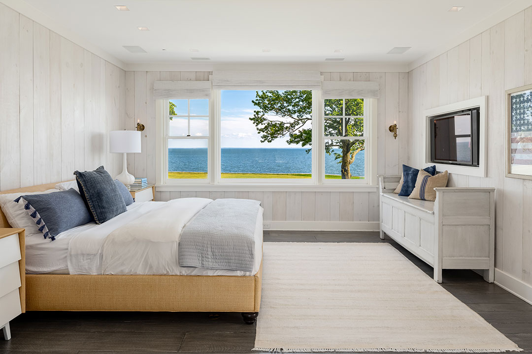 Architect Roger Ferris designed the 11,450-square-foot manse, which exudes classic Connecticut sophistication. It boasts five bedrooms, five-and-a-half bathrooms, a tennis court, and swimming pool. Wandering its spaces, it’s easy to imagine seamless indoor/outdoor entertaining with 400 feet of water frontage, French doors, a cocktail room, a butler’s pantry, and gracious living rooms.
