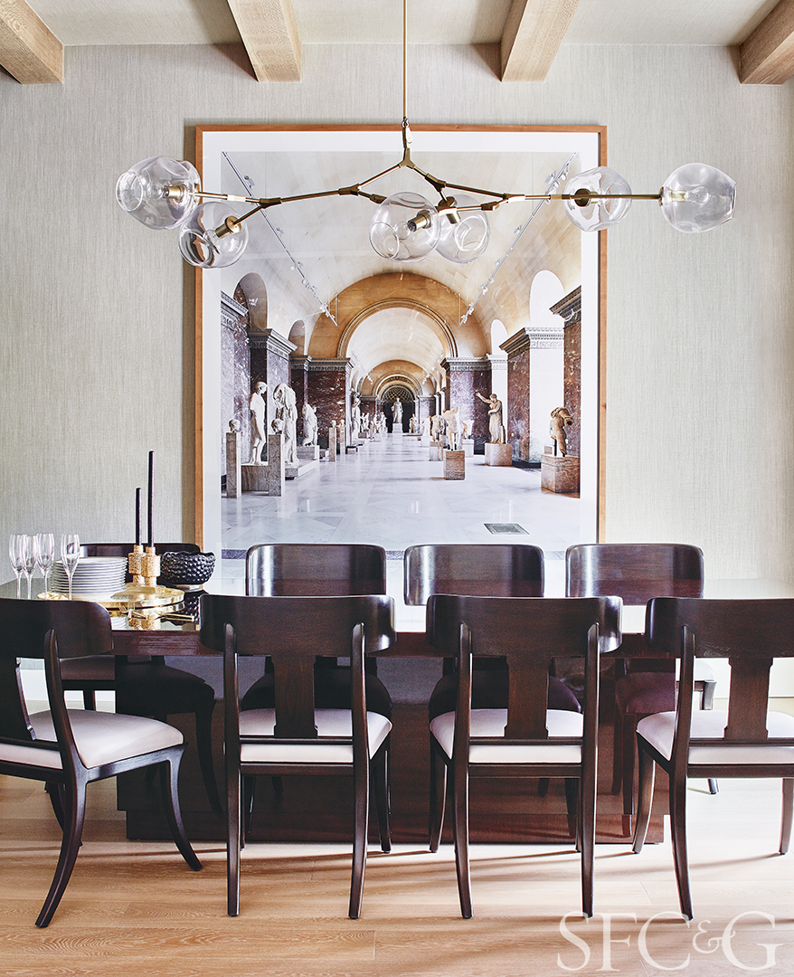 In the dining room, a Lindsey Adelman chandelier from the Future Perfect is in front of a Candida Höfer photograph of the Louvre from Ben Brown Fine Arts. Walls are covered in Mark Alexander linen; Michael Taylor chairs have leather seats from Edelman Leather.