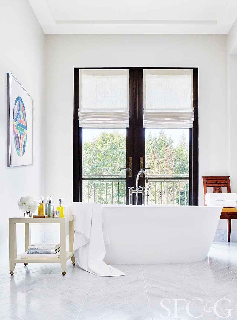 A graphic work by Frank Stella dominates the master bathroom wall. The MTI bathtub features a Dornbracht faucet. The grasscloth-covered cart with brass casters is by William Laman.