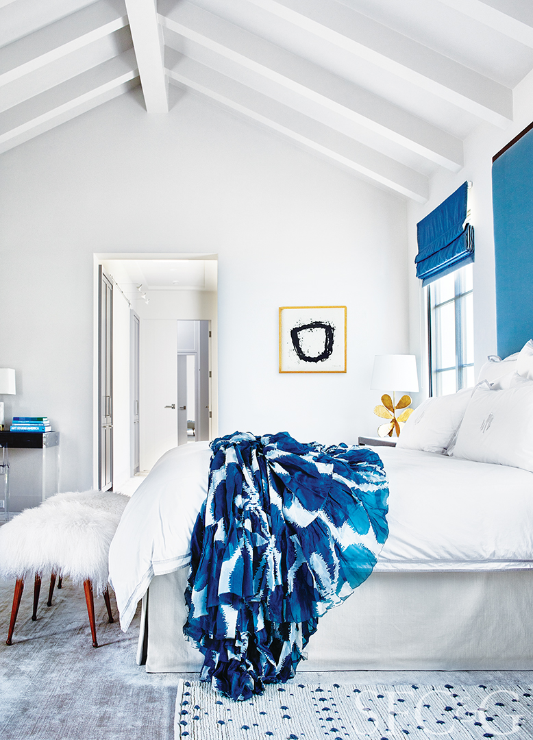 In the master bedroom, the custom headboard is upholstered in blue silk; Mongolian fur stools are from Coup D’Etat; arwork is Richard Serra.