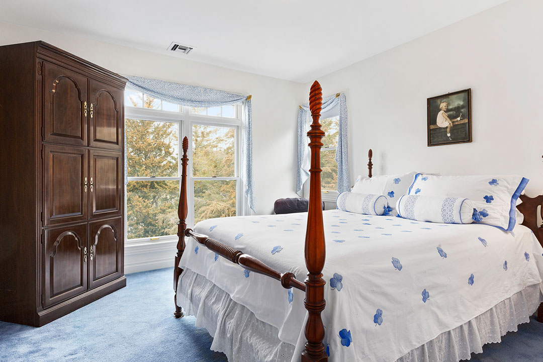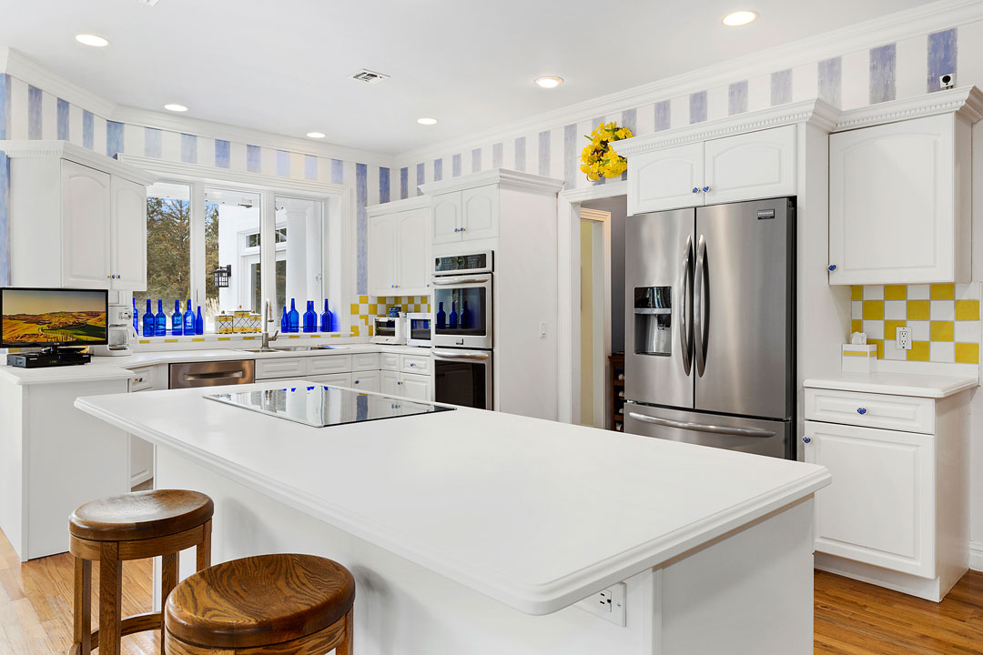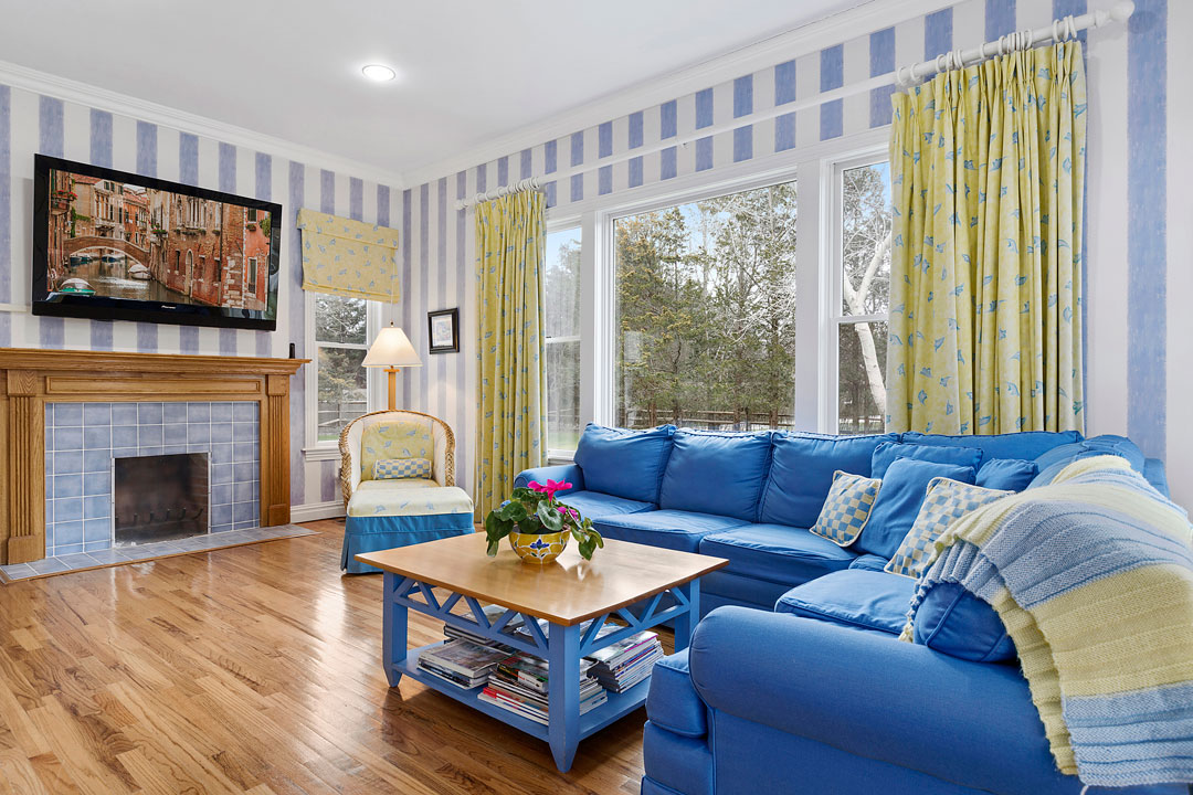The airy 4,500-square-foot home is located in Southampton’s estate section and sits on an acre of landscaped property with a gunite pool, rolling lawns and several patios for outdoor entertaining. Inside, there are 5 bedrooms along with formal living and dining areas, a spacious kitchen and an adjacent family room, all bedecked in a cheerful palette (think blue-striped walls and a yellow backsplash in the kitchen).