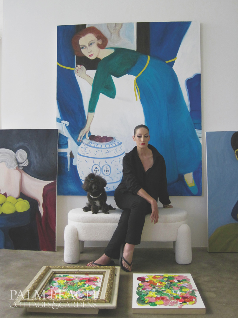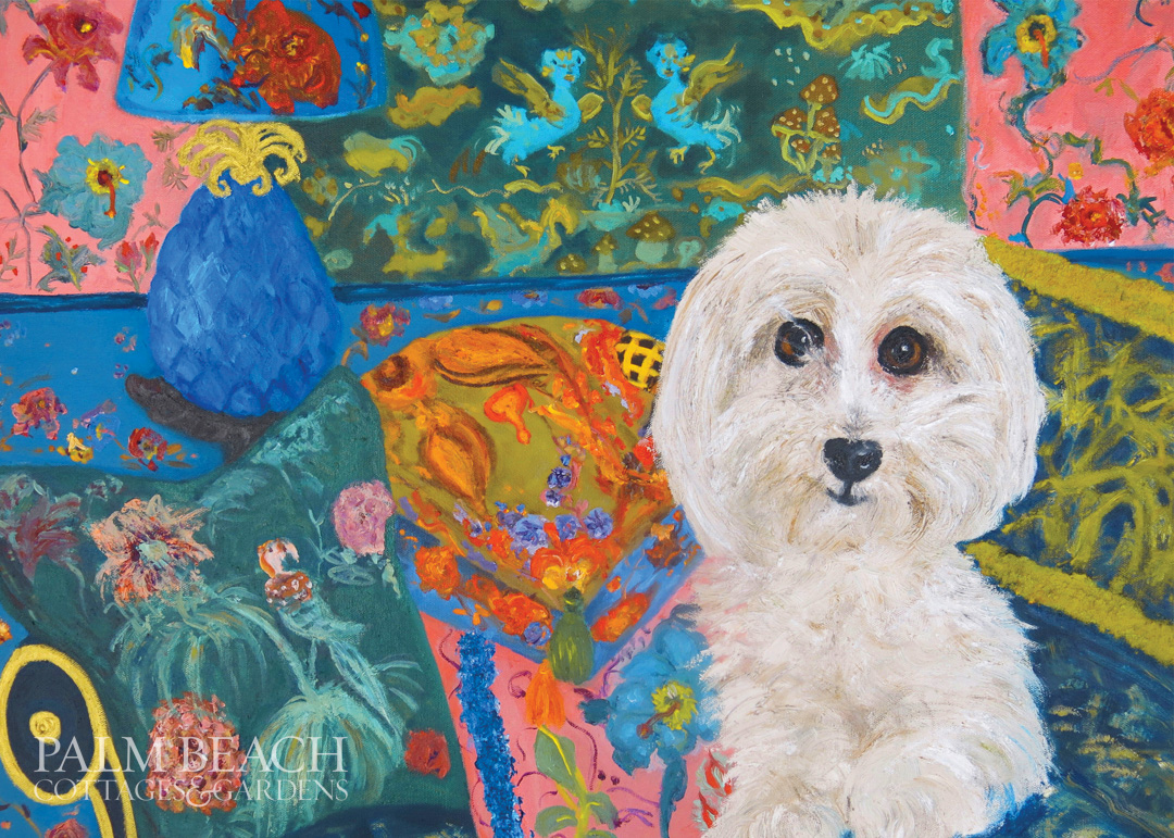 Palm Beach Cottages & Gardens commissioned Gevis to create original works, including this issue’s cover: an exotic cockatoo sitting on a rattan chair; a lounging lizard sunning poolside; and a majestic peacock, perched on the arm of a sofa. All are bejeweled in dramatic necklaces. It was a wonderfully creative collaboration!