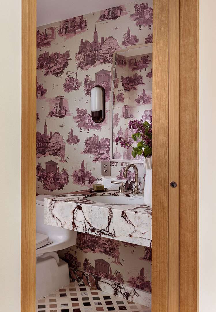 The wallpaper is from Timorous Beasties. It’s called New York Toile. It’s an unexpected twist of a traditional toile pattern that showcases urban scenes of NYC—some of them grittier than others. It was the perfect choice to use in the powder room as a statement piece, but one that didn’t take itself to seriously.