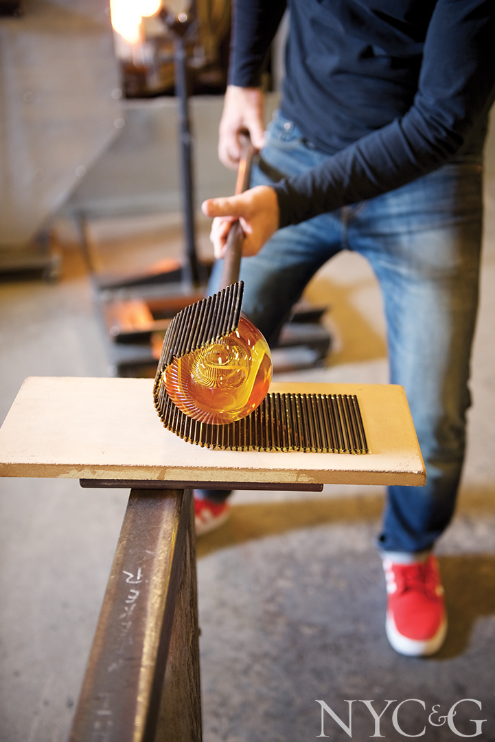 For the next step, Holtzinger attaches a second blowpipe to the open end of the tube-shaped piece. At this point, he cuts the glass in half (he can make two lights with one tube), closes up the openings, and continues working with one portion. The assistant blows into the pipe while Holtzinger continues to shape the inflated glass; once complete, the object is transferred to a punty, from which he expands the opening on the opposite end (this becomes the bottom of the finished piece). Finally, the fixture is placed into an annealer to cool gradually, before it is transferred to the couple’s Red Hook workshop, where they fit it with brass hardware. “The material changes minute to minute, hour to hour, and week to week,” says Holtzinger. “The process never gets old.”