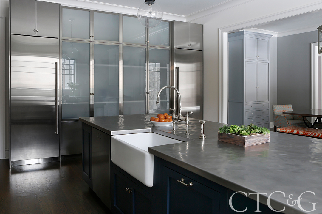 Sage Design wanted the dark navy island to create a good dark/light contrast with the stainless counters. The ROHL faucets and farmhouse sinks add a touch of simple beauty to the space. This kitchen gets a work out every day with many kids’ meals served at the island. Sage Design was able to create a unique, beautiful space that would hold up to constant use. The project, located in Southport, Connecticut, was completed in January 2017 and was published in Connecticut Cottages and Gardens in 2017.