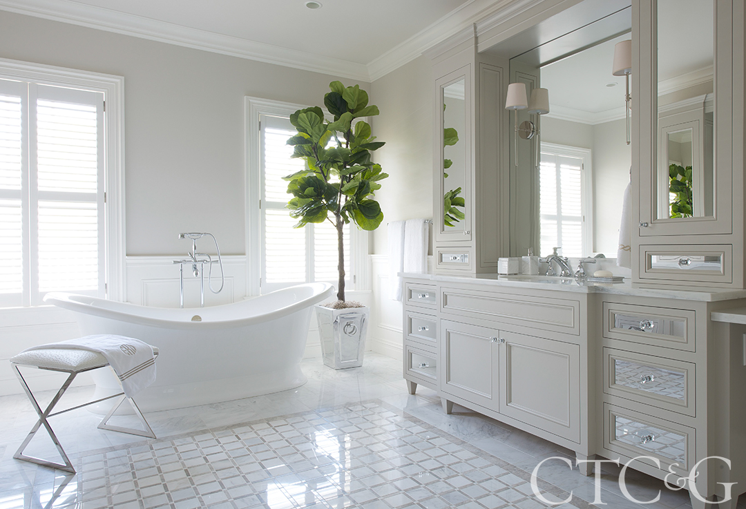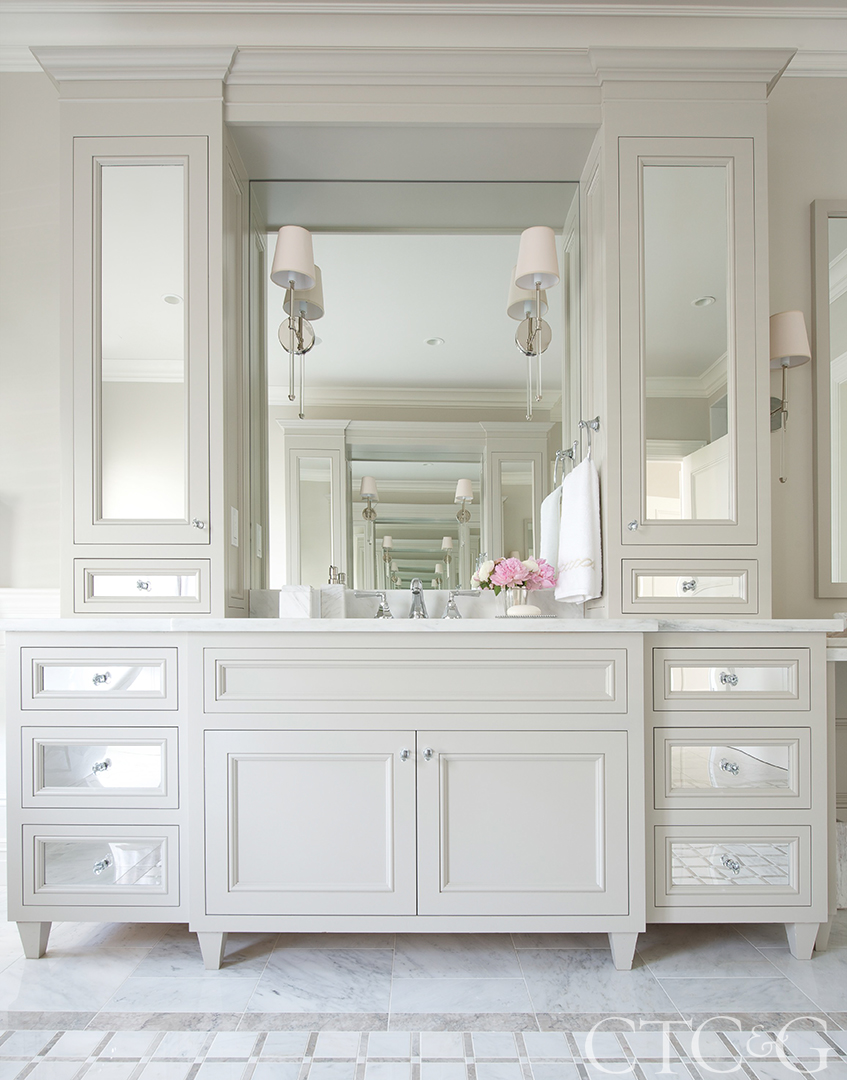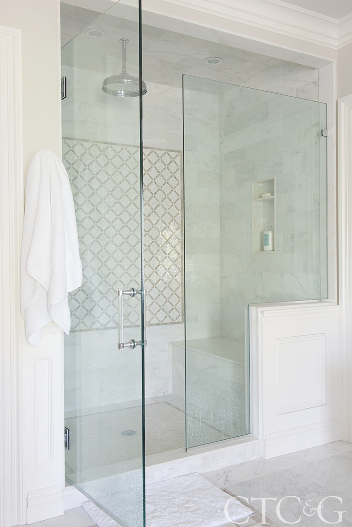 A blend of dsran white marble and Spanish grey, the bath blends the elegance of white marble with warmer hues including the taupe painted cabinetry.