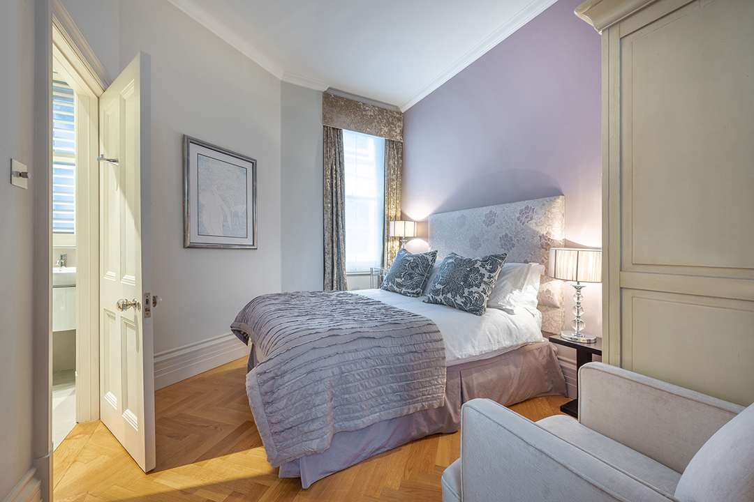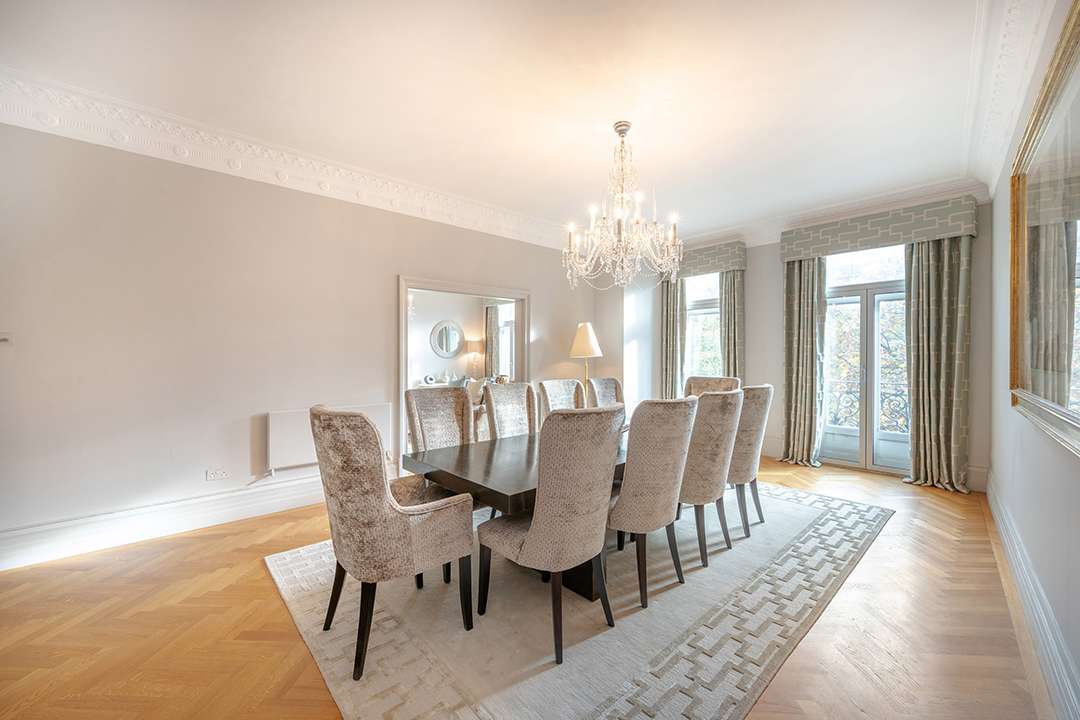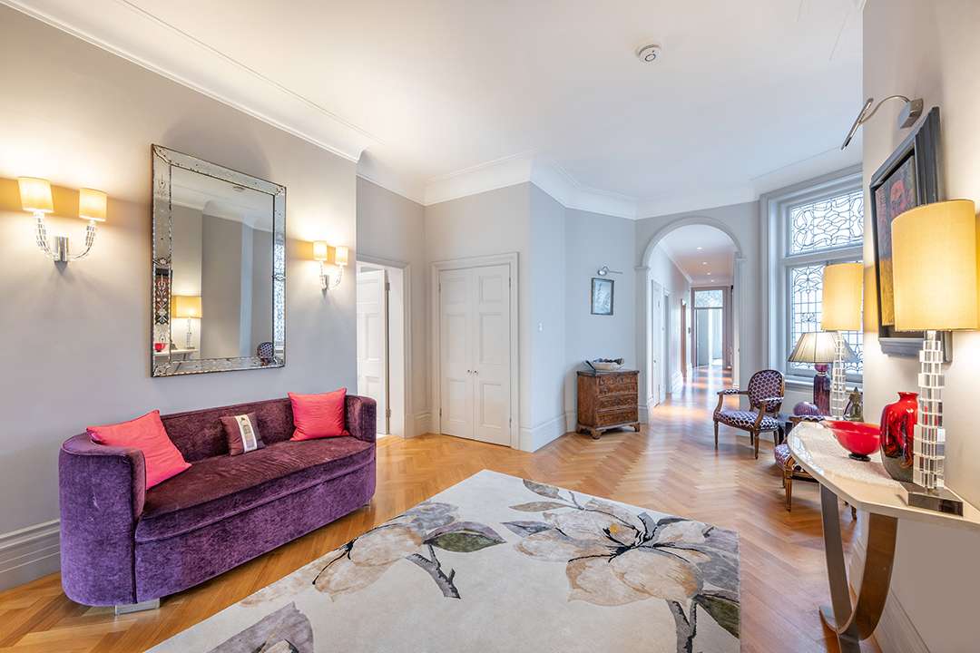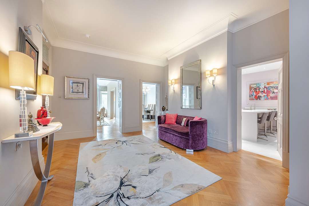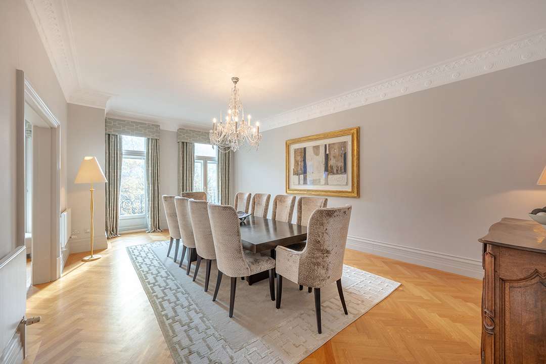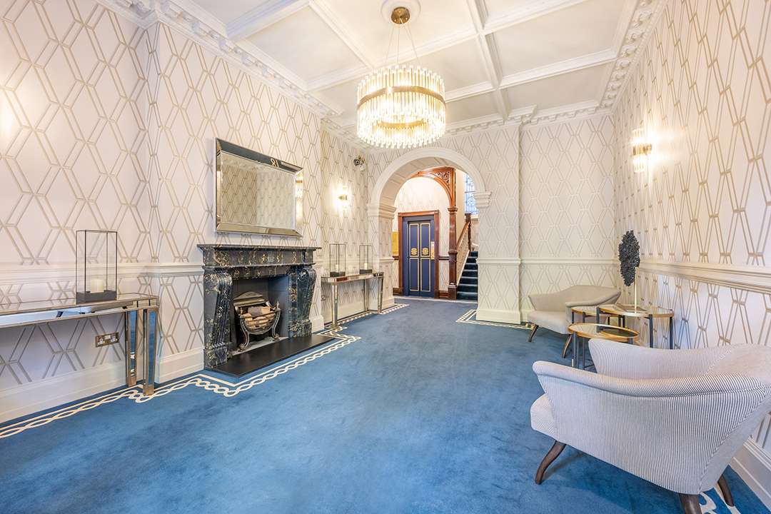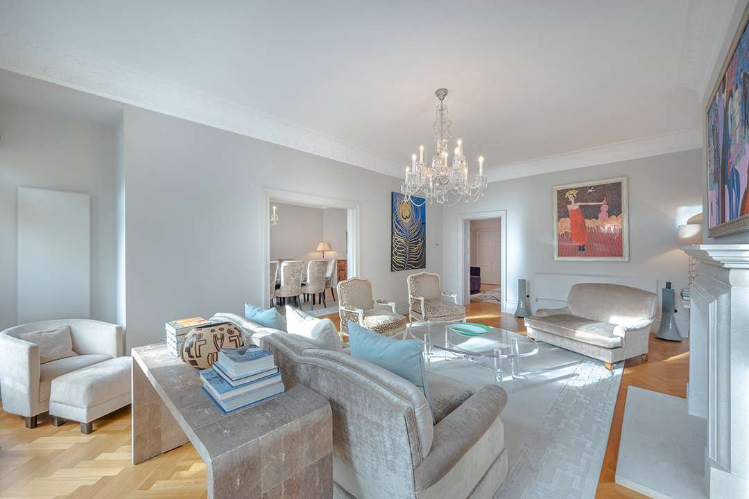 Today, the four-bedroom penthouse remains a symbol of London status and luxury. It has generous rooms and ornate moldings, yet feels light and fresh with its huge windows and high ceilings. The kitchen has clearly been reimagined recently, displaying a sleek design, while the rest of the interiors feel timeless and elegant.