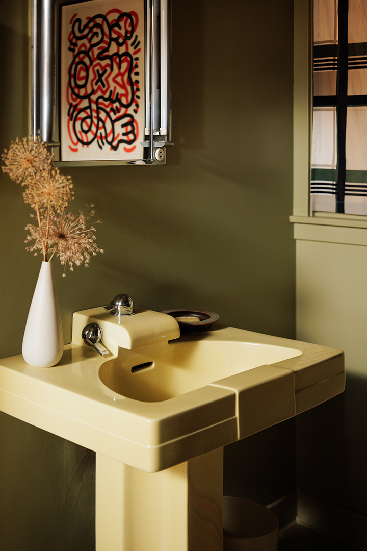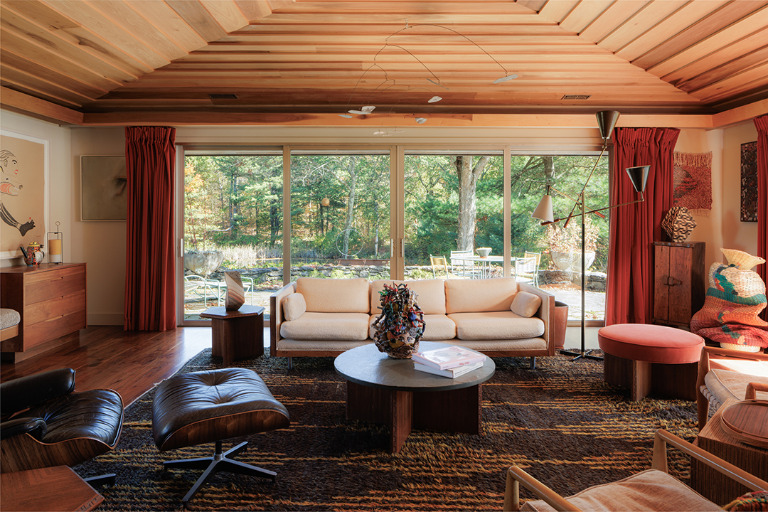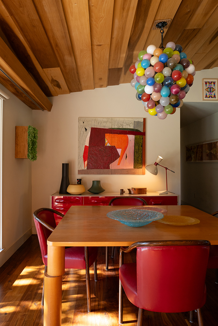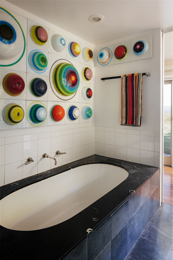 While the 4,000-square-foot residence set on 40 acres exudes tranquility and organic minimalism, in keeping with midcentury modern architecture, it also holds vibrant decor elements. You can’t help but smile seeing the colorful, gumdrop light fixture above the dining table or the eye-like wall art above the primary suite tub. It’s these pops that give the home its delicious quirkiness, while other features like the living room’s stone fireplace and wood-paneled ceiling pour in warmth.
