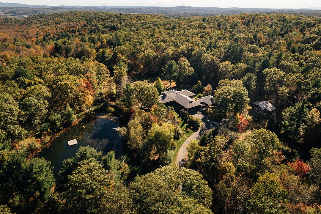As well as the four-bedroom main house, there’s a detached artist studio with a sauna and a large craftsman-style barn that was constructed by a local artisan. All perched on one of the highest points in Columbia County, these structures provide gorgeous Hudson Valley views, including of the property’s own swimming pond and gorgeous grounds. Native plantings and exotic trees mingle, surrounding lovely stonework and sculptures.