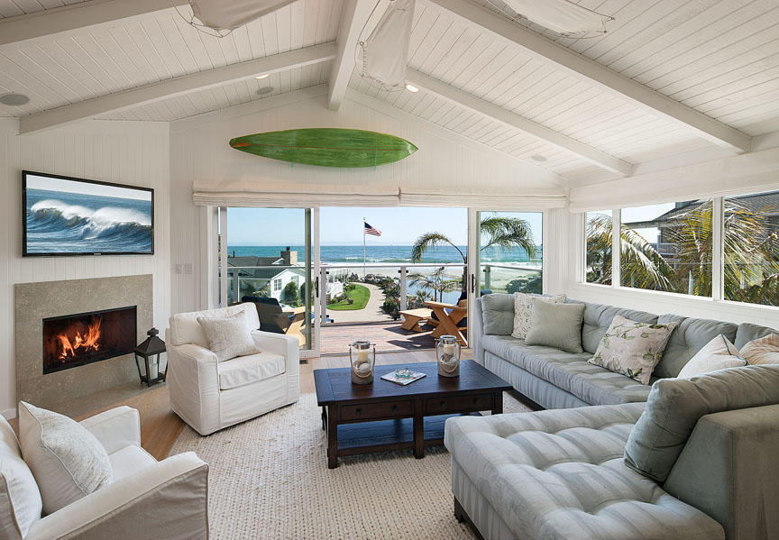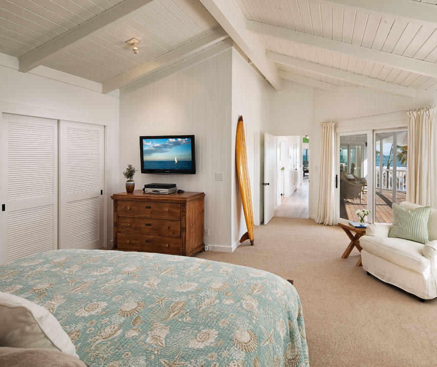 The family’s new getaway offers a relaxed, beachy vibe with beamed cathedral ceilings and white oak flooring. The main house features a recently renovated open concept kitchen that has ocean views and access to the patio and a master bedroom with a private ocean-facing patio. A separate guesthouse offers a full kitchen, living room, bunkroom and master bedroom as well as a patio.