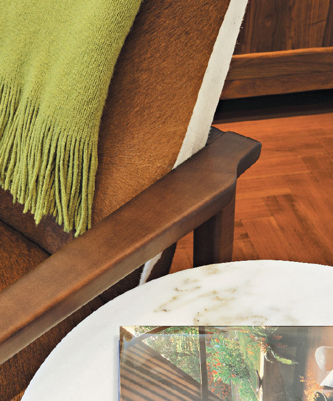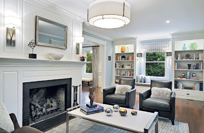 A Hubbardton Forge lighting fixture anchors the main seating area. The window seat is lit by unique Tango Lighting sconces that have LED lights in the tips.