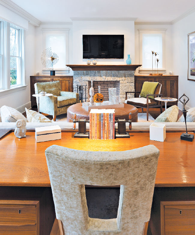 Generous seating was a priority in the family room. The six-seat Arhaus Dune sofa is covered in durable Kravet ultrasuede. A distressed leather ottoman is right at home on a Safavieh rug. The Dexter chair sits next to a white adjustable-height Little Friend table from Design Within Reach. A work space was created with a vintage desk chair covered in Pindler & Pindler fabric and a mid-century Danish desk, both from Irwin Feld Design.