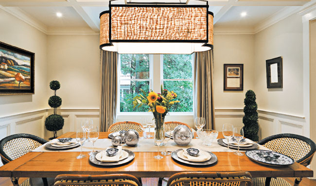 A lighting fixture from Metropolitan Lighting Fixture Co. hangs over a Kravet double pedestal table in the bistro-inspired dining room.