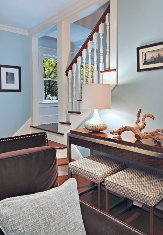 In the living room, Duncan stools from Mitchell Gold + Bob Williams add extra seating and stow conveniently under a Kravet Mozambique console table.