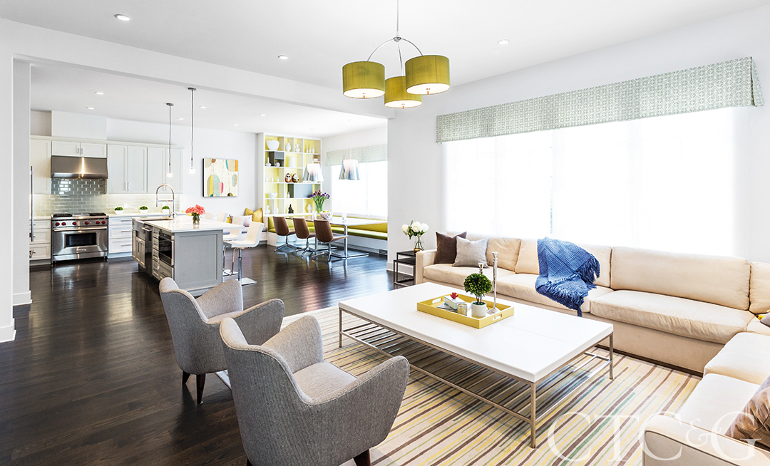 The clients were life-long city residents, but with a baby on the way, they decided to take the big step out of Manhattan into a townhouse in the tony suburb of Darien. “We liked that it was new construction and that we could personalize the space,” says the husband. “But when we looked at the builder’s story boards in the model homes, everything looked too traditional and cookie cutter. We wanted something like our downtown apartment—but better!” In their case, this translated to modern, light-filled rooms.