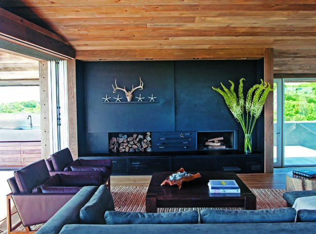 Soaring Heights | The great room’s ceiling is made from oak boards that were soaked in saltwater and weathered before installation. Burnished-copper dining tables are from Desiron; the Mark Albrecht dining chairs and counter stools and Bassam Fellows leather easy chairs are all from Suite New York. The gray microfiber sofa is from De La Espada.