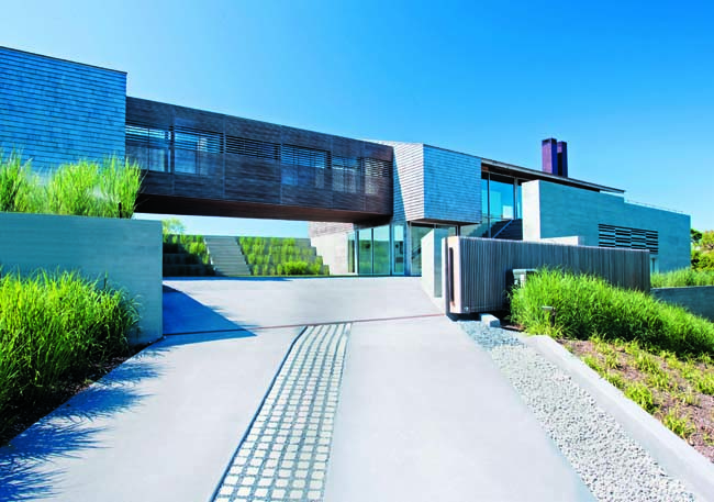 Bridge And Tunnel | A bridge ties together two unmatched, two-story sections of the house, with ample room for parking, garage space and guest rooms below. By siting the structure on a hillside, architect Paul Masi was able to incorporate several different styles of stairs into the design, along with native plantings, such as grasses.