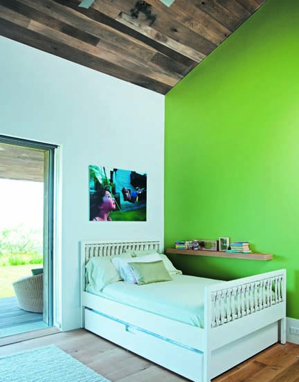 Green Room | A daughter’s room includes a white limed-oak trundle bed from Ducduc and a portrait printed on nylon.