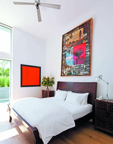 Asian Fusion | In a guest room, a work by Raphael Mazzucco hangs above a teak bed from Indonesia. Homeowner Alicia Zarou Scanlon bought the side cabinets in Beijing and commissioned the smaller work by Vietnamese artist Hong Viet Dung.