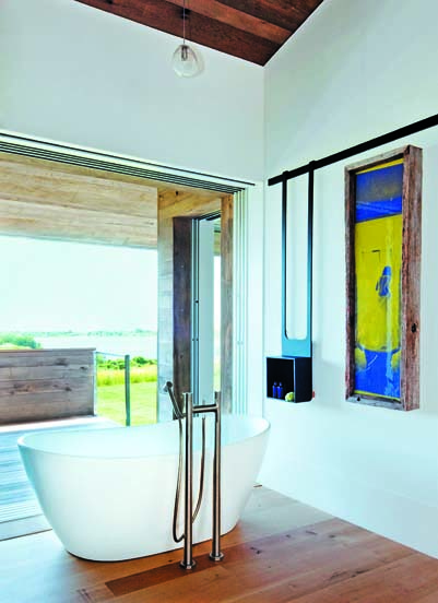 Shelf Life | Referencing the barns that used to stand on the property, Masi designed the hanging shelf system, based on an abstracted horseshoe shape, for the master bathroom. The tub is by Wetstyle.