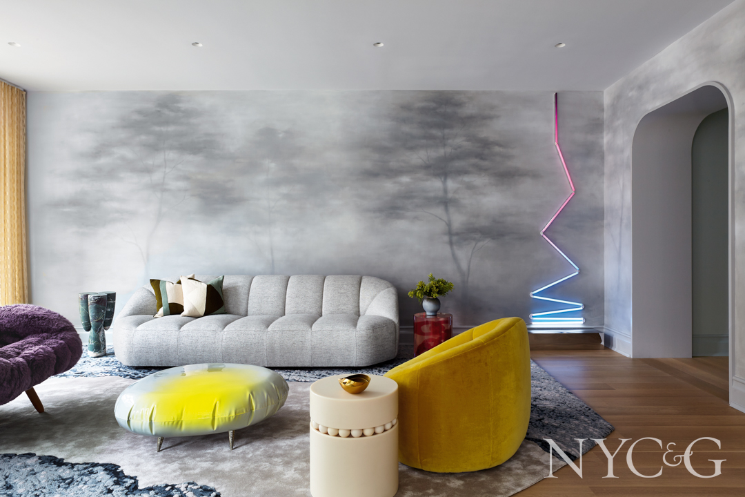 Designer Elena Frampton “knew right away” that she wanted to include a mural in this NYC living room. “I knew I wanted it to be blurry, and I knew that I wanted a neon work layered on top of it,” she said. An ethereal, misty landscape painted by Caroline Lizarraga is paired with James Clar’s Liquid Viscosity.