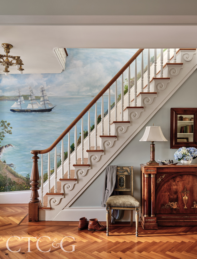 At a historic sea captain’s cottage in Connecticut, artist Mark S. King of MSK Decorative Art hand painted the 19th-century clipper ship Twilight, which was built on the nearby Mystic River and captained by one of the home’s original owners.