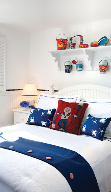 Bits of Whimsy | On the Maine Cottage guest bed, a sailor hooked pillow and pillows in a crab and starfish motif. A handmade blue ribbon runs above the beadboard.