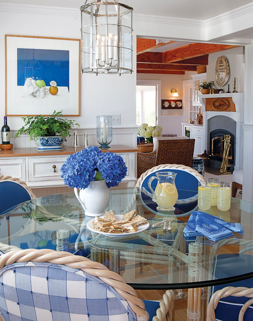 Sitting Pretty | In the living room, Dujardin chose a marine blue from Summer Hill Ltd. for the sofa and loveseat. The sconces are by Nessen; the cocktail table was custom-made by Matthews & Parker. The Fred Ely basket came from the Dane Gallery in Nantucket; the mohair throw from Nantucket Looms.