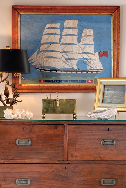 Finishing Touches | The cherry-topped buffet was made to order and features nontoxic paint and finishes. The ship’s lantern above the McGuire glass-topped dining table was made in England; the bulbs are from France.