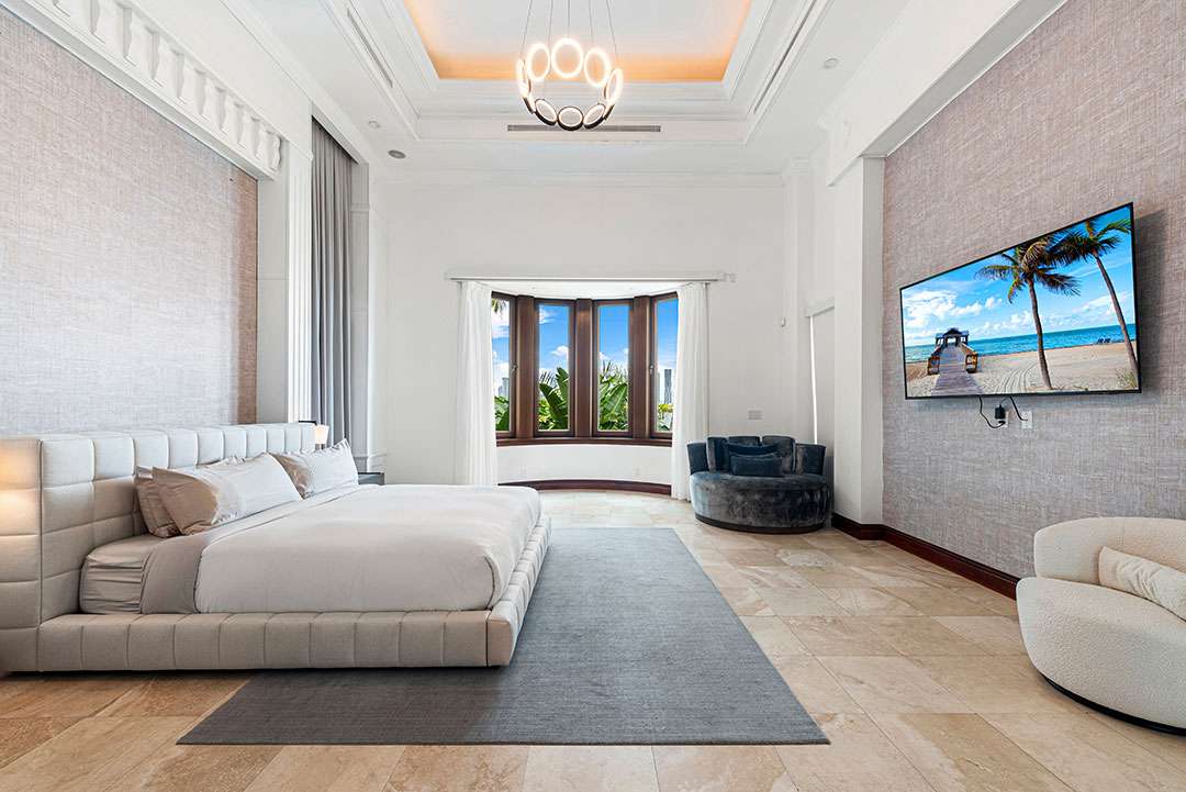 The spread boasts 125 feet of water frontage, a dock with a boat lift, a swimming pool, and views of the city’s skyline. The 6,090-square-foot Mediterranean-style home includes five bedrooms, five full bedrooms, and two half-baths. The exclusive island is fit for a celebrity. It includes police presence and security. Plus, a playground, tennis court, and of course, a basketball court.