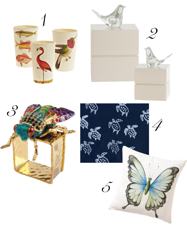 1. Incorporating vintage animal renderings, Samantha J Lowe’s hand-decoupaged votive candleholders will brighten up any occasion. $48 each, at Calypso St. Barth, 21 Newtown Ln., East Hampton, 631-329-0033.