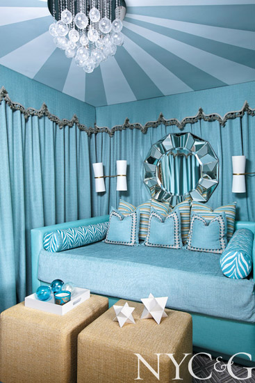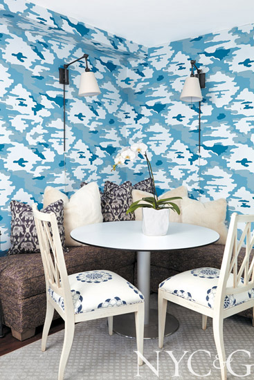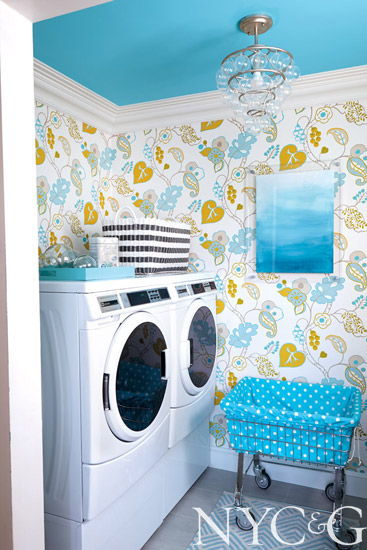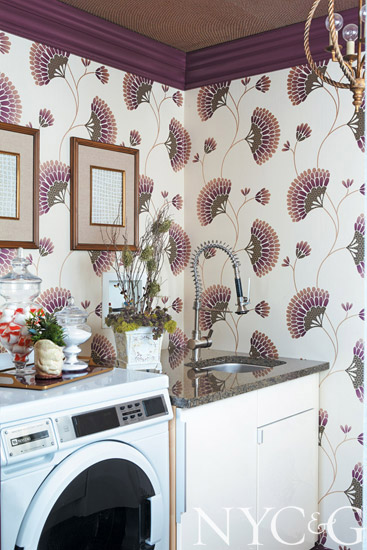 Laundry rooms don’t typically corner the market on sophistication, but designer Christine Gentile’s six-by-nine-foot space proves otherwise. ‘Function came first, with a commercial-grade front-loading washer and dryer,” she says. Bright and cheerful came next, thanks to a whimsical tree-of-life wall covering from Clarke & Clarke and a polka-dotted Duralee fabric for the ironing board cover and laundry basket. Adding more fun: a Currey & Company light fixture resembling a soap bubble.