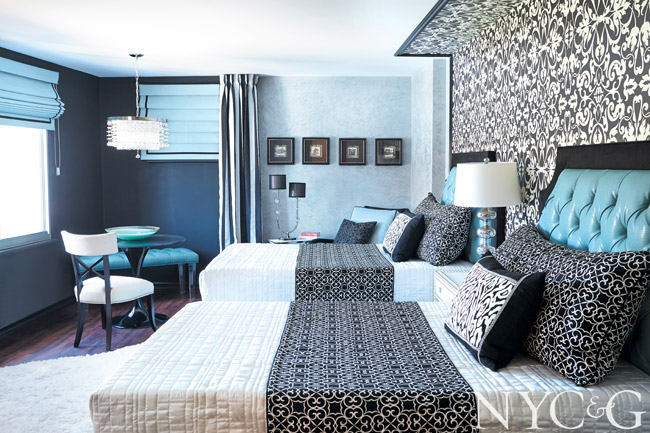 The trio of Gayle Moss, Leslie Padron, and Susan Taubman set out to “fashion a bedroom that truly worked, which meant adequate lighting and storage, a functional desk, and a sizable closet remade into a mini walk-in,” says Moss. “An icy aqua Venetian-plaster wall covering offers a polished finish, making it a soft place to land.”