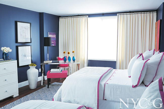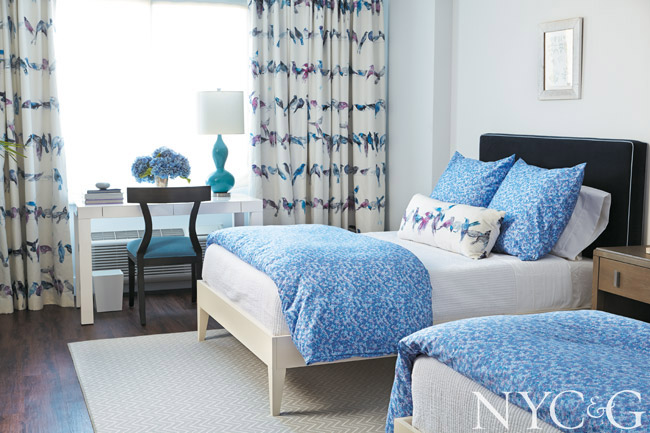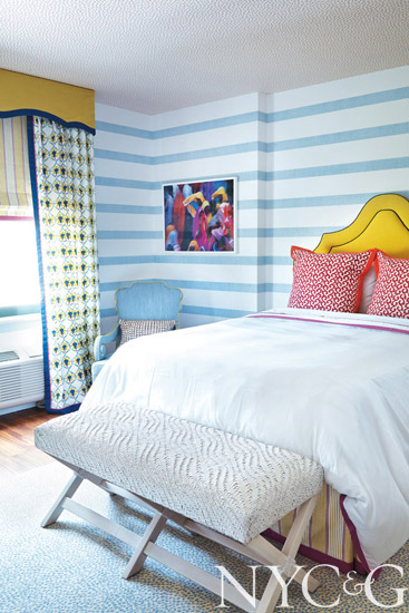 “A work entitled Dandelion became my starting point,” says Bonnie Steves of a piece she hung in this bedroom. “When a dandelion opens up, its white seeds disperse into the world, like mini-parachutes. I wanted to sow seeds here, too, for wonderful things to come.” Prints, plaids, and stripes all have a role, from an A. Rudin chair covered in a Romo plaid and turtle-motif drapery fabric from Kravet. Additionally, glass panels by Gigi Chen “illustrate the Manhattan skyline and serve as a big journal for people to leave a message.”