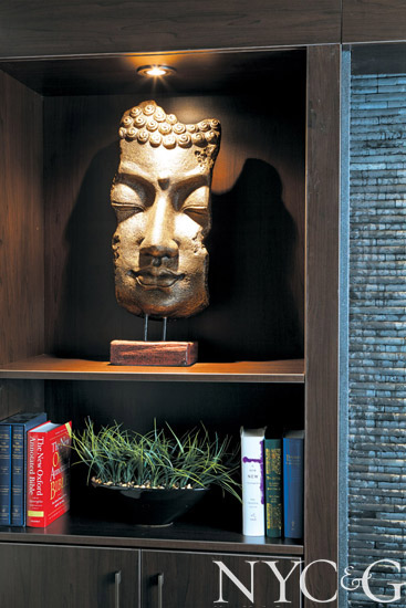 For designer Kim Hendrickson-Radovich, a space to process everything is crucial. “This meditation room is a place to disconnect,” she says. “I’ve also included feng shui principles to maintain a sense of flow.” Hendrickson-Radovich’s smart and tidy 300-square-foot room includes a water wall, shoji screens, upholstered walls, and a mini-library. “Kravet donated all the fabric, and Global Views did the same with furniture and accessories—they’ve been so generous!”
