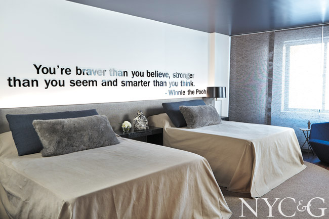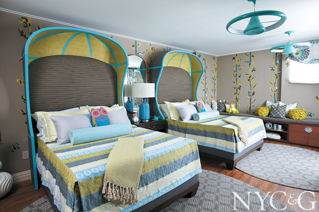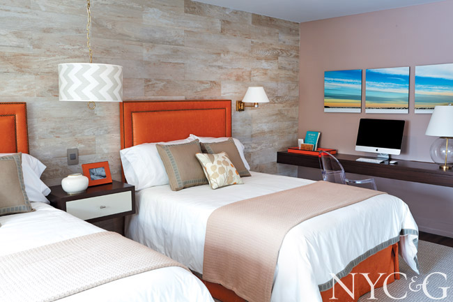 “I had a niece who had been very ill, so my desire was to craft a serene place for healing,” Katharine Posillico McGowan says of her bedroom plan. “I work closely with a faux finisher, and we dreamed up a flower-garden theme for the wall behind the beds. Next to it, I placed a big board where kids could write their thoughts and feelings. It’s inspirational, and my hope is that it will help the families during the time they are here.”