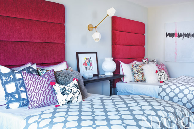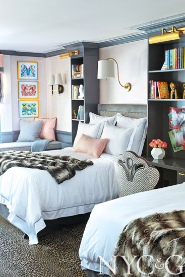 For this bedroom, designed by Stephanie Woodmansee and Elle Clymer, the goal “was to produce a very calming space for the families,” Woodmansee says. “The room takes on a spa-like feel, with gray-blue paint and black four-poster beds, and pops of color provided by Kelly Wearstler fabrics and Madeline Weinrib ikat-print pillows.”