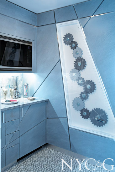 Designer Rachel Florez was thrilled to take on the design of the kosher dairy kitchen, but its mere six-by-nine feet required careful planning. More important to Florez was function. “I wanted a place families could walk into at the end of a hectic day and use with ease. I even met with two rabbis to ensure every detail was right! Knowing that hungry kids would periodically be waiting for meals, I also built an interactive toy gearbox on one wall to stave off boredom.”