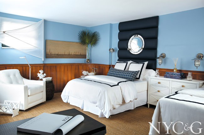 “This bedroom is oddly shaped, almost like a boat,” says Keith Baltimore, “so I thought, Why not make people feel like they could sail away at any moment? I want families to get the impression that they’re docking here for a very short time.” The design took on aspects of a high-end yacht, with walls made to imitate teak and headboards fashioned with portholes. The bedding is a crisp white with navy trim, which further emphasizes the nautical color scheme.